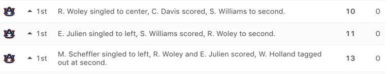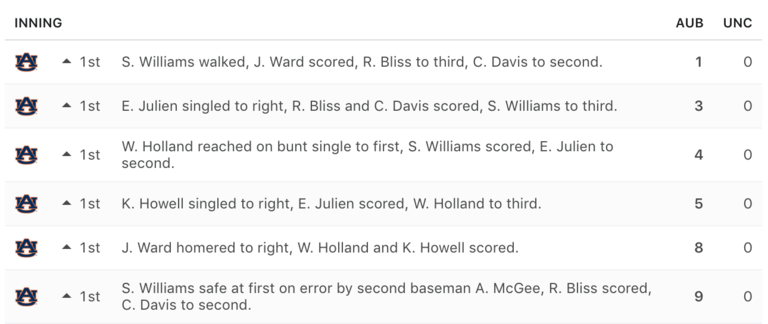 Before the Tar Heels could even reach the plate, they trailed by almost two full touchdowns, as Auburn came out swinging, literally. The Tigers scored 13 runs in the top of the first inning to essentially put the game out of reach before it even started: