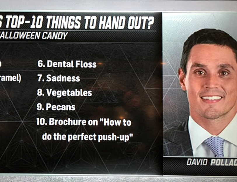 HOWEVA, it did enter my mind when seeing this viral photo of Pollack's “top 10 things to hand out instead of Halloween candy” list that's making the rounds on Twitter. You may not see a more terrifying list of things in your life: