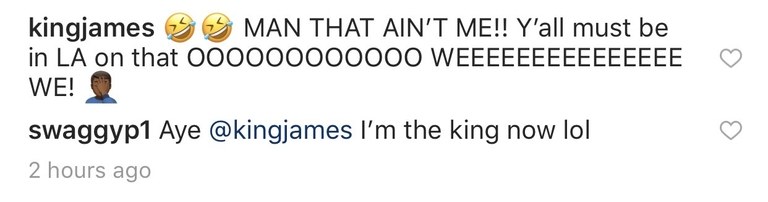 But while LeBron's reply was good, Swaggy P's is even better. "I'm the king now lol" he types, gleefully prodding Mr. Taco Tuesdays' wounded pride. No word yet on whether Young will be receiving a cease and desist from LeBron Corp. for the unauthorized use of that trademark, but here's hoping James goes as easy on him as he did on the well-dressed doofuses that started this whole mess.