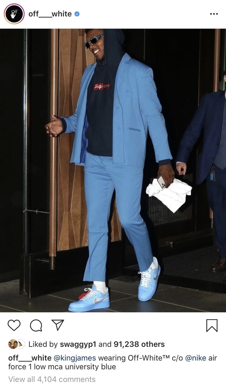LeBron James. Nick Young. If you know anything about basketball—and we mean literally anything—then you also know that there's not a single shared molecule between them. One is an all-time great. Arguably the GOAT, depending on who you ask. The other is most famous for cheating on Iggy Azalea. One is substance. The other is style. One is going straight to Springfield, the other to The Masked Singer. So if you're a fashion brand and you're going to tweet about basketball, you better make sure you have LBJ and Swaggy P straight. Just ask Milan streetwear brand Off-White, who this week heaved up a big ol' air ball this week when they posted a photo of Young rocking their new Nike Air Force One collab but tagged LeBron instead. Whoopsie.