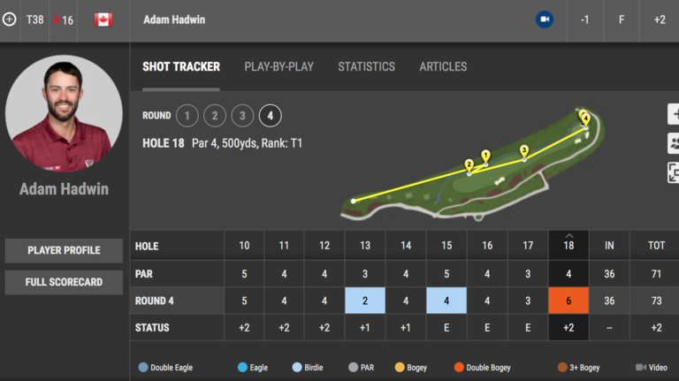 FacebookPinterestBut our research would indicate that Kizzire is wrong on this one. If you go back to the Wells Fargo leader board on PGATour.com, you'll find that Hadwin had a hell of a time on the 18th hole at Quail Hollow that week. On Thursday, he pulled his drive into the creek that runs all the way down the left side of the par 4 finisher and made double bogey. Friday he actually did okay, hitting the fairway and making par. But in his third round he found the creek again, which led to a bogey. Then came Sunday, when he found the creek AGAIN and made another double bogey.